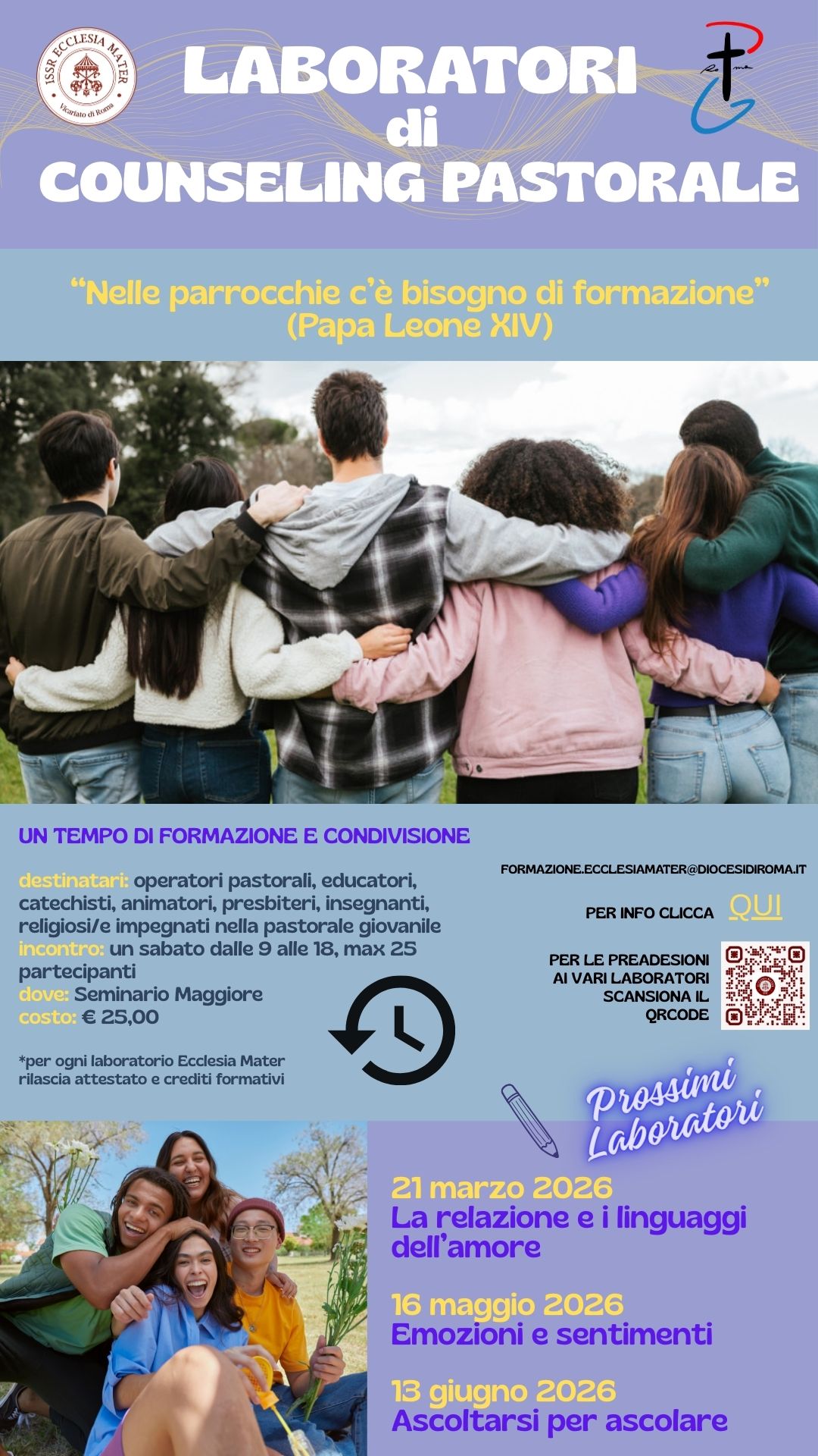 “Mi pare urgente impostare una pastorale solidale, empatica, discreta, non giudicante, che sa accogliere tutti, e proporre percorsi il più possibile personalizzati, adatti alle diverse situazioni di vita dei destinatari. […]. Nelle parrocchie c’è bisogno di formazione e, laddove non ci fossero, sarebbe importante inserire percorsi biblici e liturgici, senza tralasciare le questioni che intercettano le passioni delle nuove generazioni ma che interessano tutti noi: la giustizia sociale, la pace, il complesso fenomeno migratorio, la cura del creato, il buon esercizio della cittadinanza, il rispetto nella vita di coppia, la sofferenza mentale e le dipendenze, e tante altre sfide.” (Papa Leone XIV - Assemblea della Diocesi di Roma, 19/09/2025)