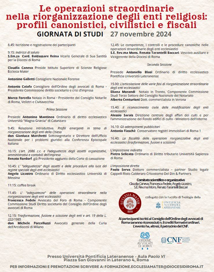 GIORNATA STUDIO: “Le operazioni straordinarie nella riorganizzazione degli enti religiosi: profili canonistici, civilistici e fiscali”